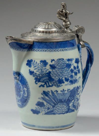 Pitcher of the East India Company and pouring twisted handle in white porcelain decorated in underglaze cobalt blue peony bouque, 18th century