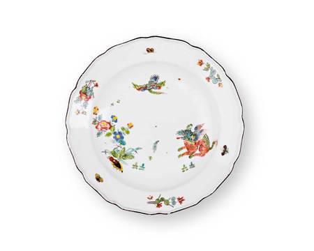 Baroque curly flag. Polychrome paint with Korean lions and Päonienstrauch, June bugs and Phoenix. Brown border line. Blue swords Meissen, 1730. Ø 21.5 cm