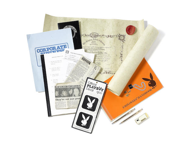including: two certificates, employee handbooks, a Bunny Training Manual, newspaper cuttings, several service awards including - two gold pens, a charm bracelet, a lighter and gold charms