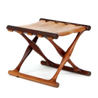 Folding stool of Brazilian rosewood. Seat with patinated natural leather.