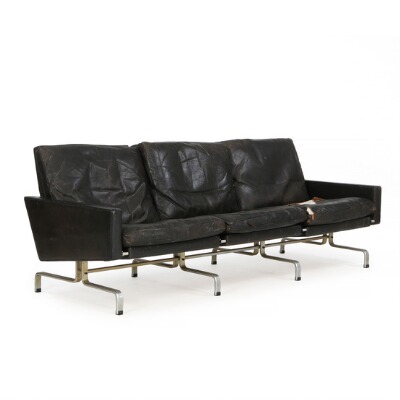 Freestanding three-seater sofa with frame of stainless steel. Upholstered with black leather.
