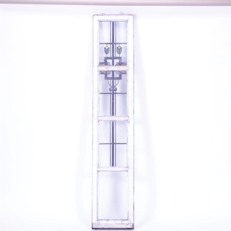 Prairie era Arts & Crafts stained leaded glass entry window with tulip flowers, vertical orientation