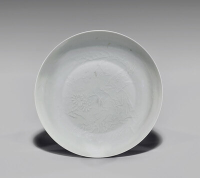 Unusual Chinese Qianlong Mark and of the Period porcelain dish; the delicate, thinly rendered circular form with moulded anhua design of a crow with wings spread, landing on flowering branches and rockery; seal mark to base; Provenance: Wolch Collect