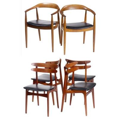 Quatre chaises en teck et deux fauteuils en chêne de style scandinave à assise en similicuir noir. Les fauteuils, dans le goût de Hans Wegner, portent une étiquette "Grundlagt 1895 N Eilersön A/S", Made in Denmark, avec pastille "Furniture Makers Dan
