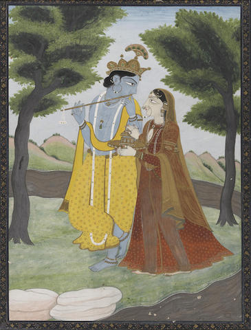 Opaque watercolor and gold on paper; a forest landscape with Krishna playing a flute and accompanied by Radha carrying a golden tray, all set within a narrow foliate-patterned border, verso with a three-line Takri inscription and Lucknow Government S