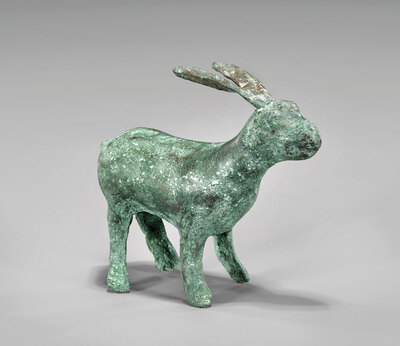 Rare Chinese late Shang Dynasty bronze model of a rabbit; standing in alert stance, and showing overall green patination; Provenance: Wolch Collection, Los Angeles; L: 6 3/4"