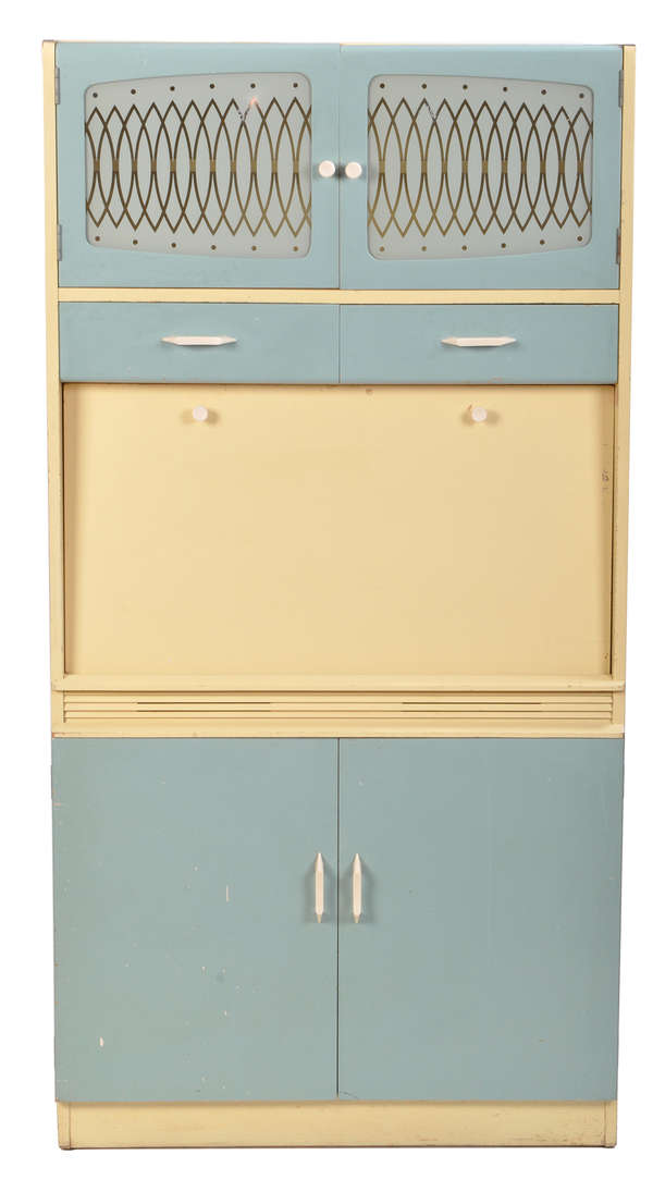 the glazed upper cabinet doors above two short drawers and fall-flap, two cupboard doors under
