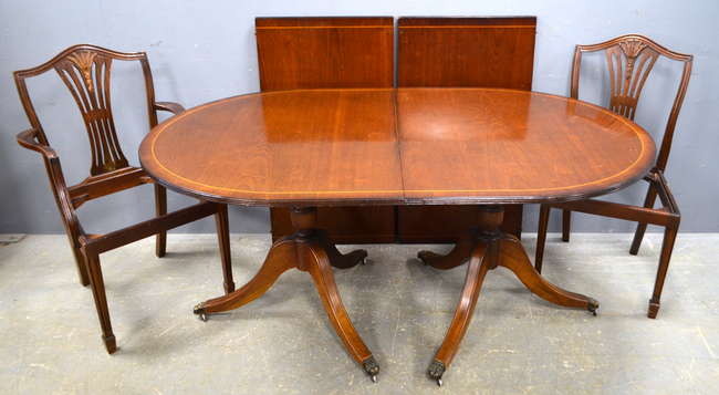 Reproduction mahogany dining table with two extra leaves and eight chairs