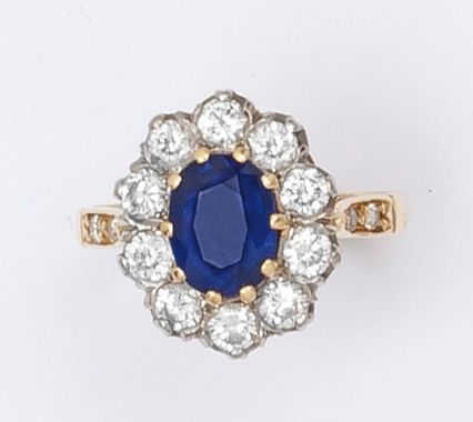 Ring in yellow gold and white gold set with an oval sapphire in a circle of diamonds brilliant-cut. Ring size: 57. P. 4.1 g