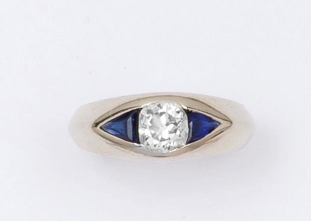 Ring "ring" white gold set with a cushion diamond shouldered two blue stones Trillion. P. 1925. 9.4 g.