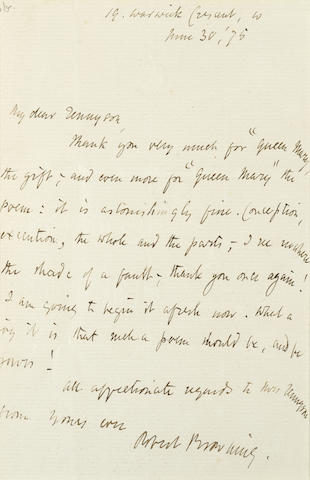 Autograph Letter Signed ("Robert Browning"), 1 p with integral blank, 8vo, 19 Warwick Crescent, W., London, June 30, 1875, to ALFRED TENNYSON, formerly mounted. Matted and framed. Provenance: Sotheby's, July 21, 1980, lot 344.