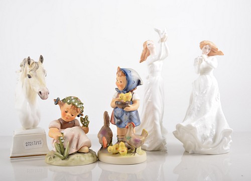 Royal Copenhagen model, Girl with a Doll No 121, height 13cm, Imari pattern rabbit paperweight, Royal Doulton figure, The Paisley Shawl, Hummel figures and other ornamental ceramics, (17).