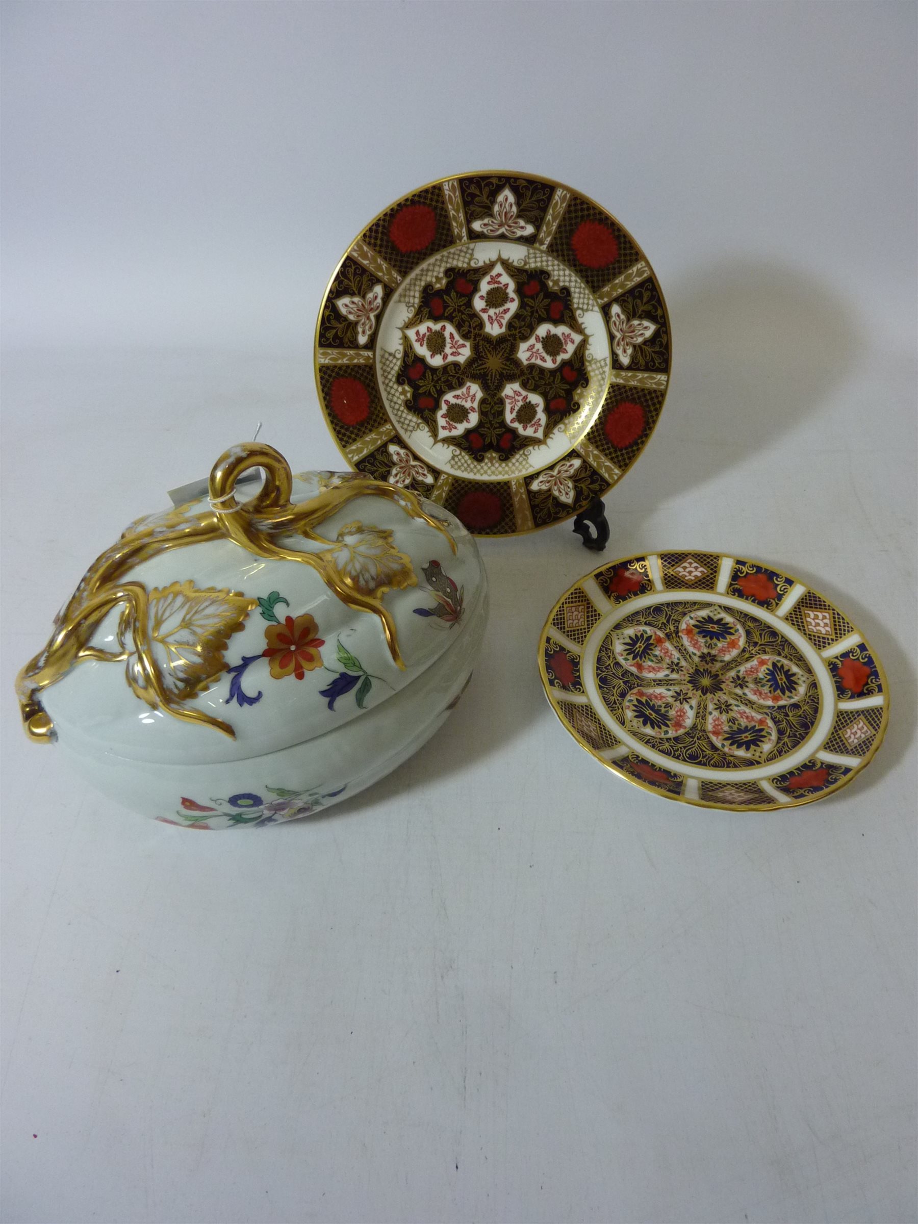 Royal Crown Derby saucer pattern no. 1128, a similar Abbeydale plate, and a Vista Allegre (Portugal) lidded bowl