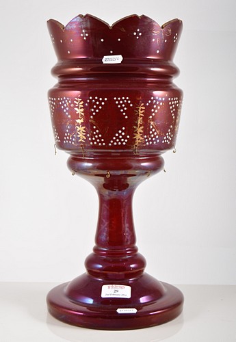 Ruby glass lustre with clear prismatic drops, all fourteen present, gilt and white jewel highlights to bowl, height 40cm.