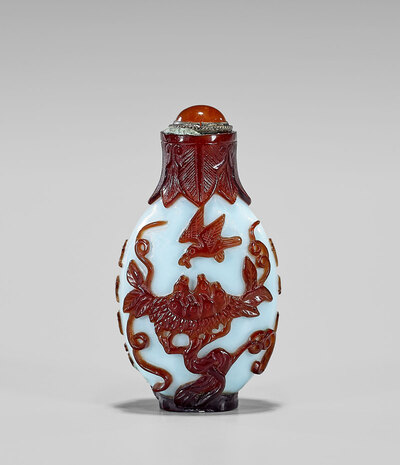 Chinese ruby-red overlay glass snuff bottle; decorated in relief with birds and flowers below foliate lappets at the neck; with inscriptions; H: 2 3/4