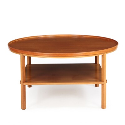 Circular mahogany coffee table with underlying shelf. Top with raised edge. Model 6687. Designed 1929. Manufactured and marked by Rud. Rasmussen's Cabinetmakers. H. 52. Diam. 100 cm.