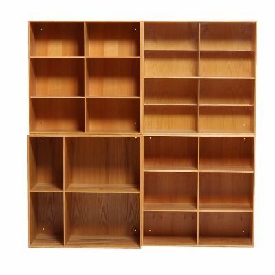Solid elm wall unit comprising a pair of bookcases, deep bookcase and and display cabinet with glass sliding doors. Made and labelled by Rud Rasmussen Cabinetmakers, Copenhagen. H./L. 76. D. 27. Deep bookcase. H./L. 76. D. 36 cm. (4)