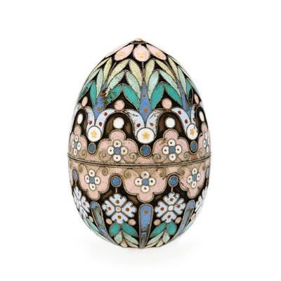 Russian silver-gilt and cloisonné enamel Easter egg. Presumably Pavel Ovchinnikov.
