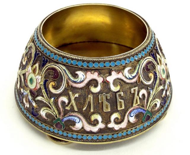 with scrolled enamel band with Cyrillic text upon four shaped feet, displaying Russian hallmarks, 3.5" diameter