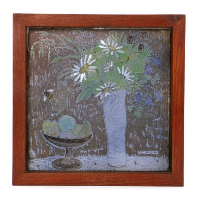 Stoneware relief, decorated with floral motif in polychrome glazes