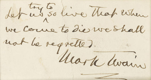 Autograph Sentiment Signed ("Mark Twain"), three lines on verso of 1 3/4 x 3 1/8 inch engraved visiting card ("Hartford, Conn"), n.d., vertical crease running the length of the card, a few faint smudges, mount mark to verso at one edge, matted and fr