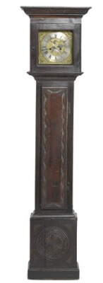 A George II dark polished oak longcase clock, square brass dial (26,5×26,5) with corner ornaments, silvered dial, movement with moon phase, date and month calendar. The dial marked 'Samuel Lawson, Keighley'. Mid 18th century. H. 209 cm. W. 54 cm. D.