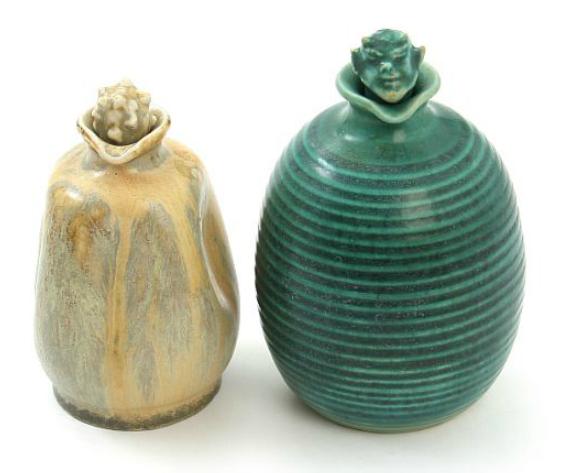 Two lidded stoneware bottles decorated with light and green glaze, lid and body modeled in relief