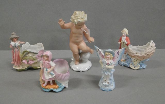 Schaubach figurin H17cm samt 4st biskvi figuriner i form av vaser, H11cm, 2 med skador