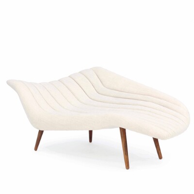 Sculptural chaise longue with round, tapering beech legs.