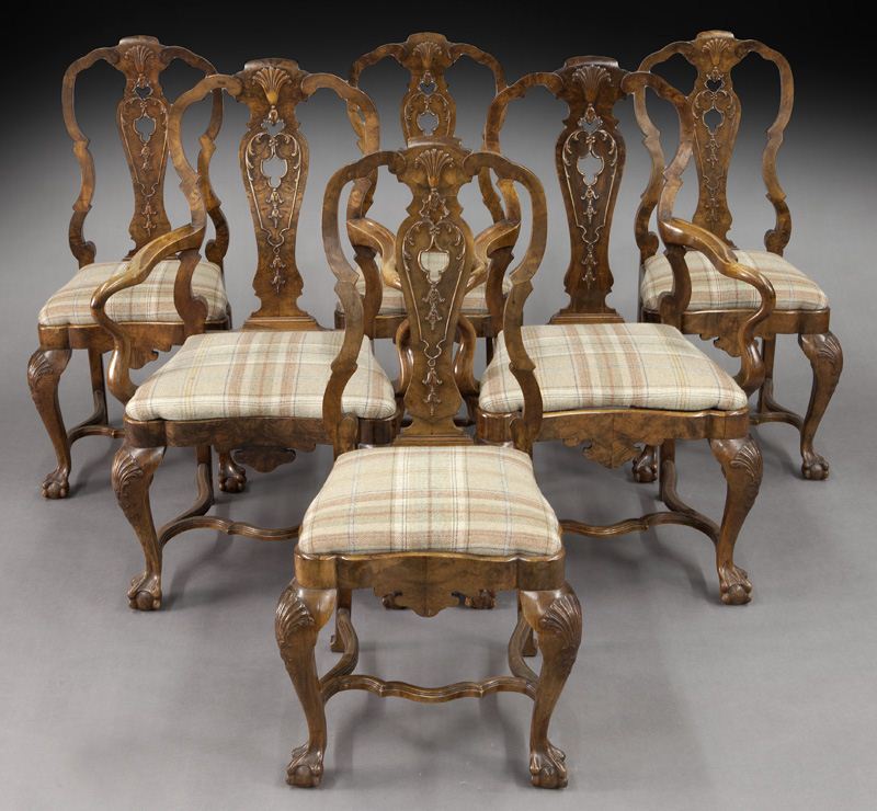 Set (6) carved walnut Queen Anne style chairs, Early 20th century