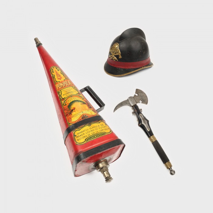 Set de Pompieri: cască, topor și pulverizator, produs de M. Carniol Fiul, București, anii 1920-1930