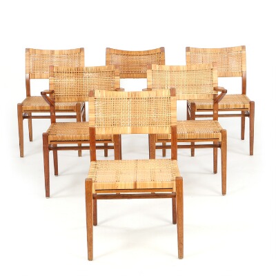 Set of six dining chairs of patinates oak, herof two with armrests. Seat and back stretched with woven cane. Designe 1953. Made by cabinetmaker Henrik Wørts. (6)