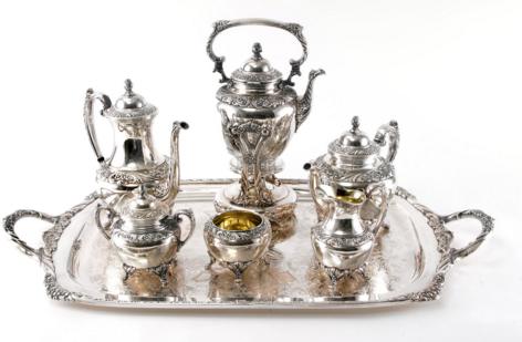 Comprising a hot water pot, teapot, coffee pot, creamer, sugar, covered waste bowl and undertray