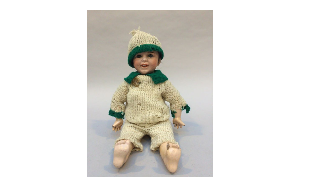 eyes gray sleepers cilia (small chip on the left eye), open mouth two teeth. Body composition and papier maché (small chips) arms two joints, double-jointed legs. head marked SFBJ 236 Paris and a label on the back. knitted wool dress