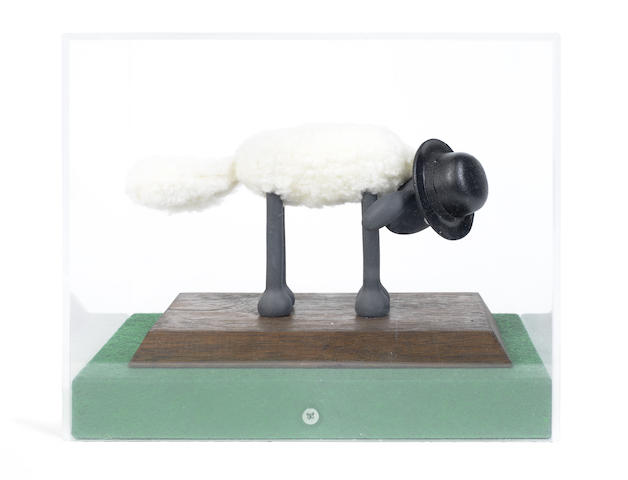 a character model, hand made from Fimo and wool by Nick Park, on wooden stand under perspex cover, accompanied by a certificate signed by Nick Park
