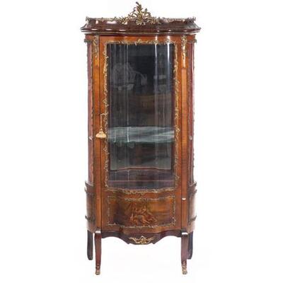 Showcase Louis XV style curved, low part with scenery and landscape scene, bronzes and ornaments with shells and garlands of flowers, two glass shelves and velvet interior