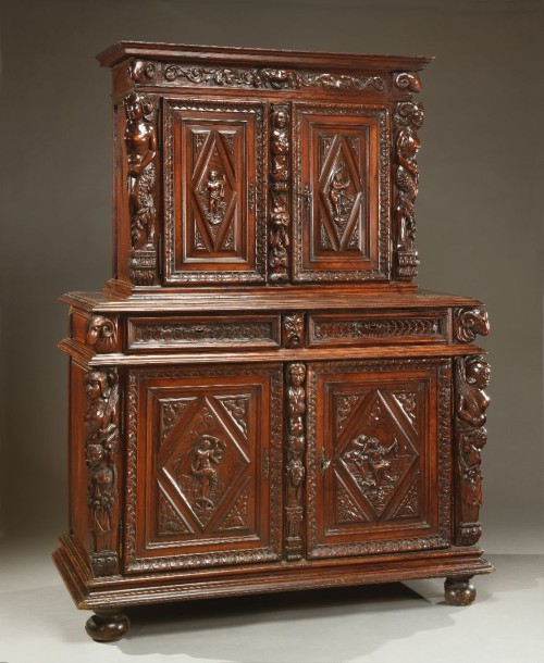 Buffet two bodies in walnut molded and carved with friezes of foliage, plumes, ram's heads, masks, terms of warriors, satyr women, characters of mythology and dragons.
