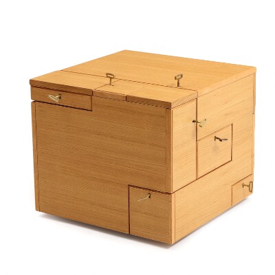 A multi functional oak cabinet, top with leaf, sides with several drawers and a secret compartment.