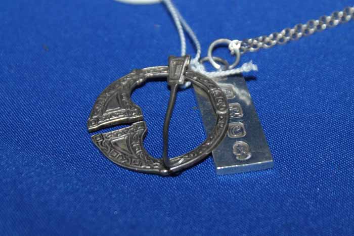 SILVER INGOT PENDANT AND CHAIN and a Scottish silver brooch of antique design (2)