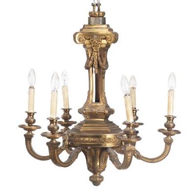 Louis XVI style six-light chandelier in gilded bronze with arched arms decorated with bunches of grapes and adorned at the top of its main axis of the three heads of goats and garlands.