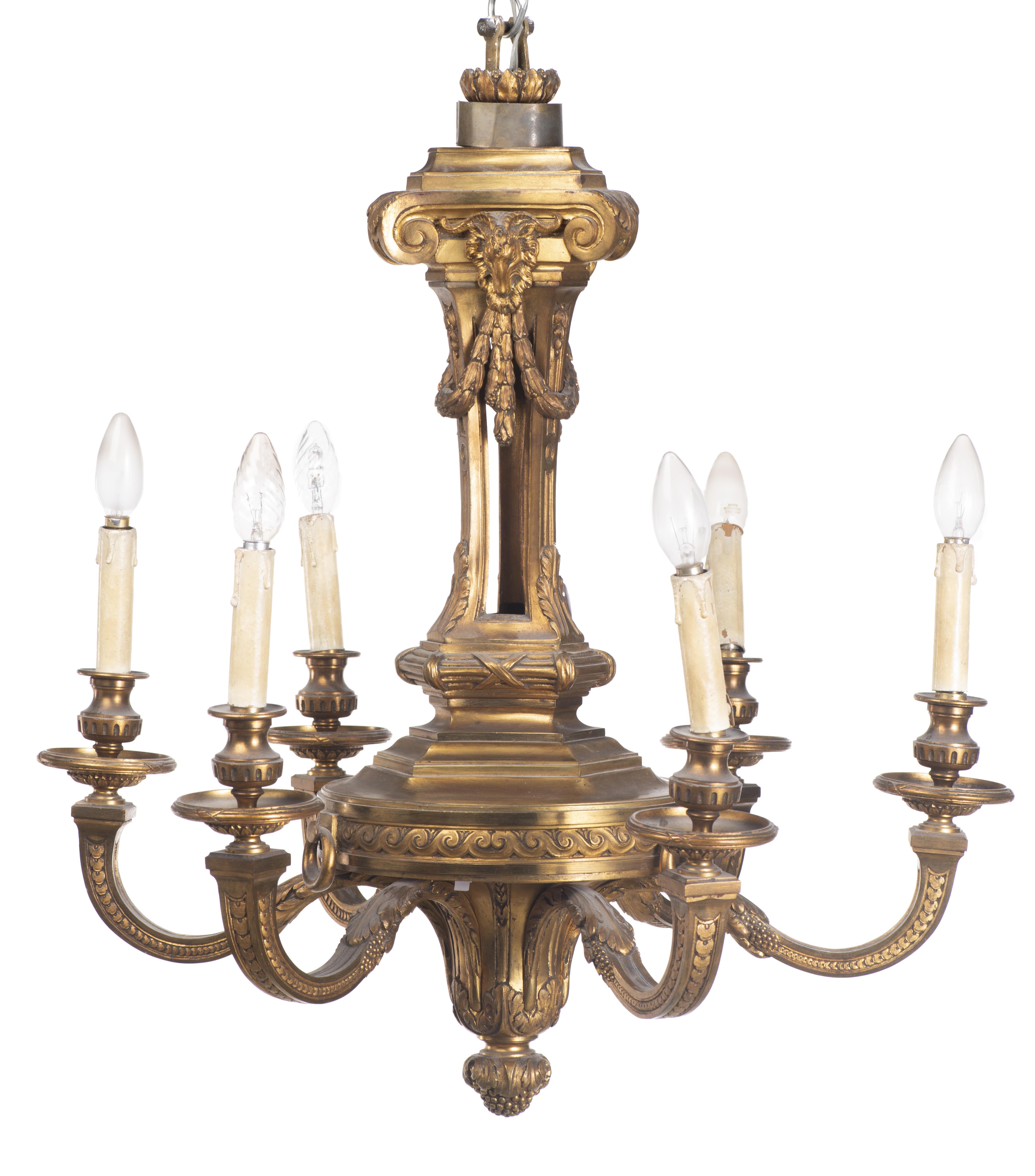Chandelier with six lights of st. Louis XVI gilded bronze arched arms decorated with bunches of grapes and adorned at the top of its main axis of three heads of goats and garlands.