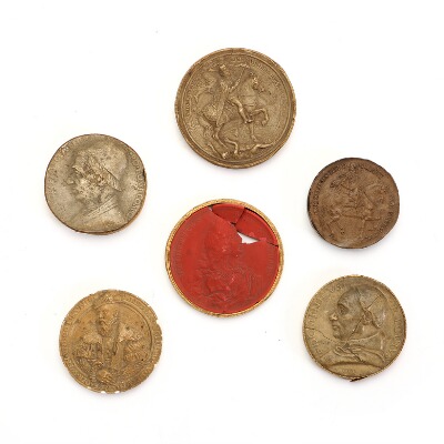 Six various circular castings of plaster and a single with red lacquer with motifs in the form of portraits and kings on horse.