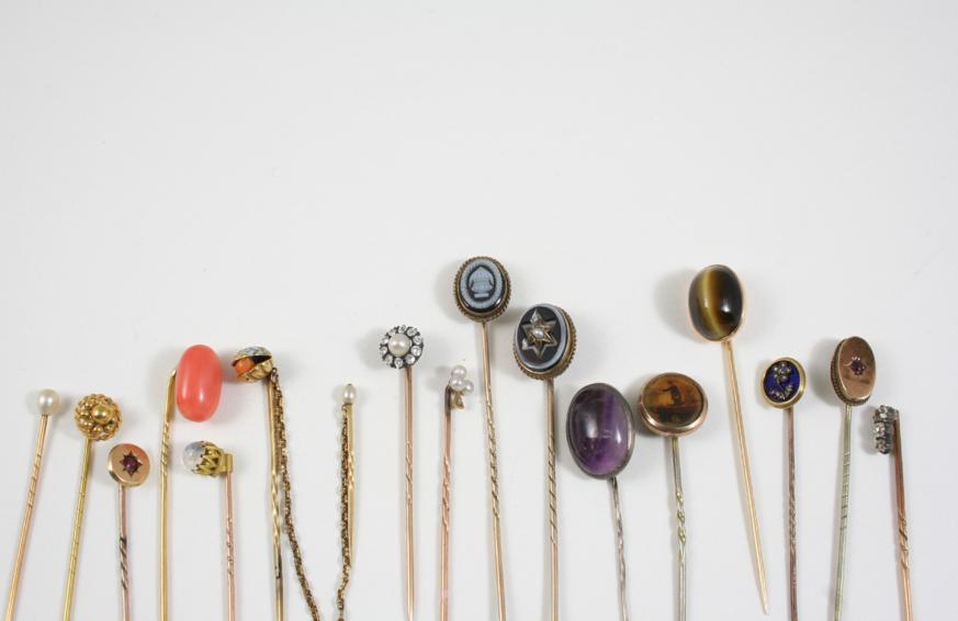 SIXTEEN ASSORTED GOLD AND GEM SET STICK PINS