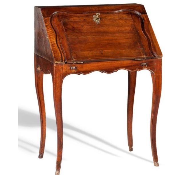 Small walnut sloping desk, it opens by a fretted leaf revealing three drawers and three lockers, and rests on arched feet ribbed.