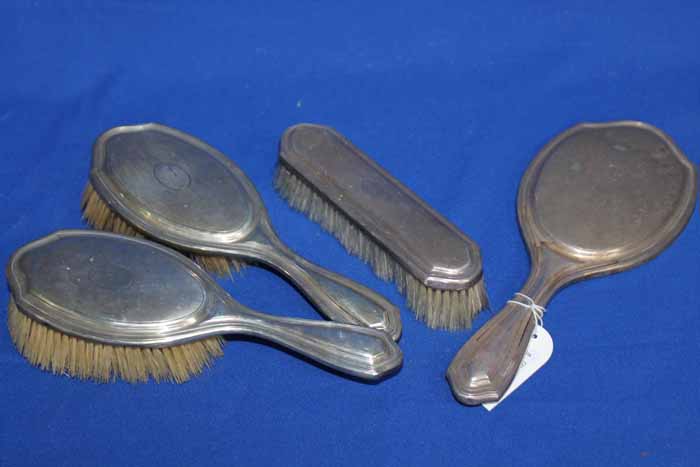 STERLING SILVER VANITY SET attractive engine-turned design, comprising two hair brushes, one clothes brush and a hand mirror
