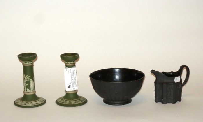 Basalt ware and jasperware. Candlesticks stamped Wedgwood