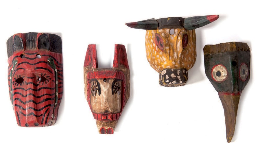 Suite of four masks Wooden carved polychrome decorated with fantastic animals