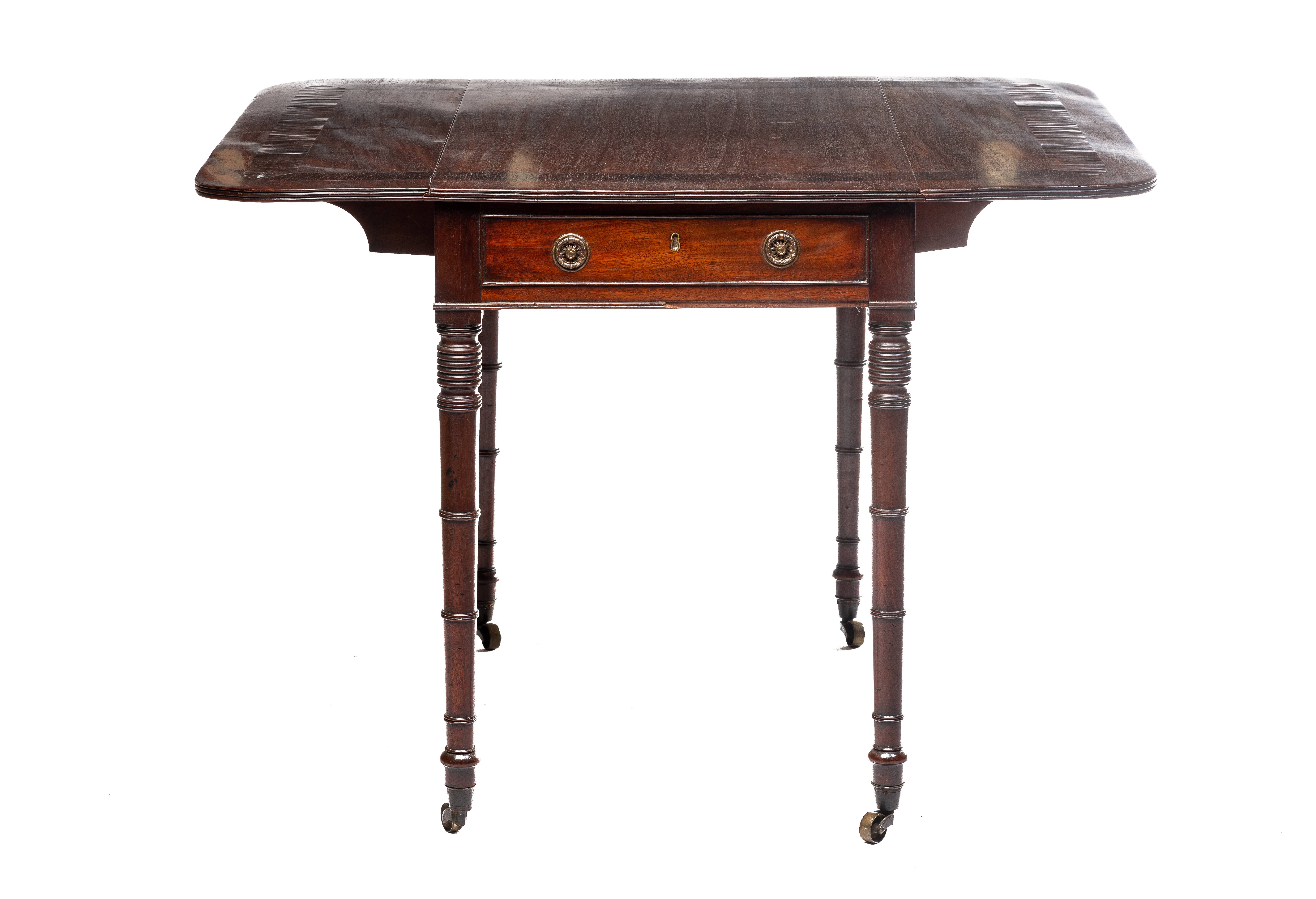 Table à oreilles en acajou dite pembroke table, 4 pieds en bois tourné terminant par quatre roulettes en laiton, un tiroir dans la ceinture et un faux tiroir. Plateau avec incrustation d'une bande de palissandre