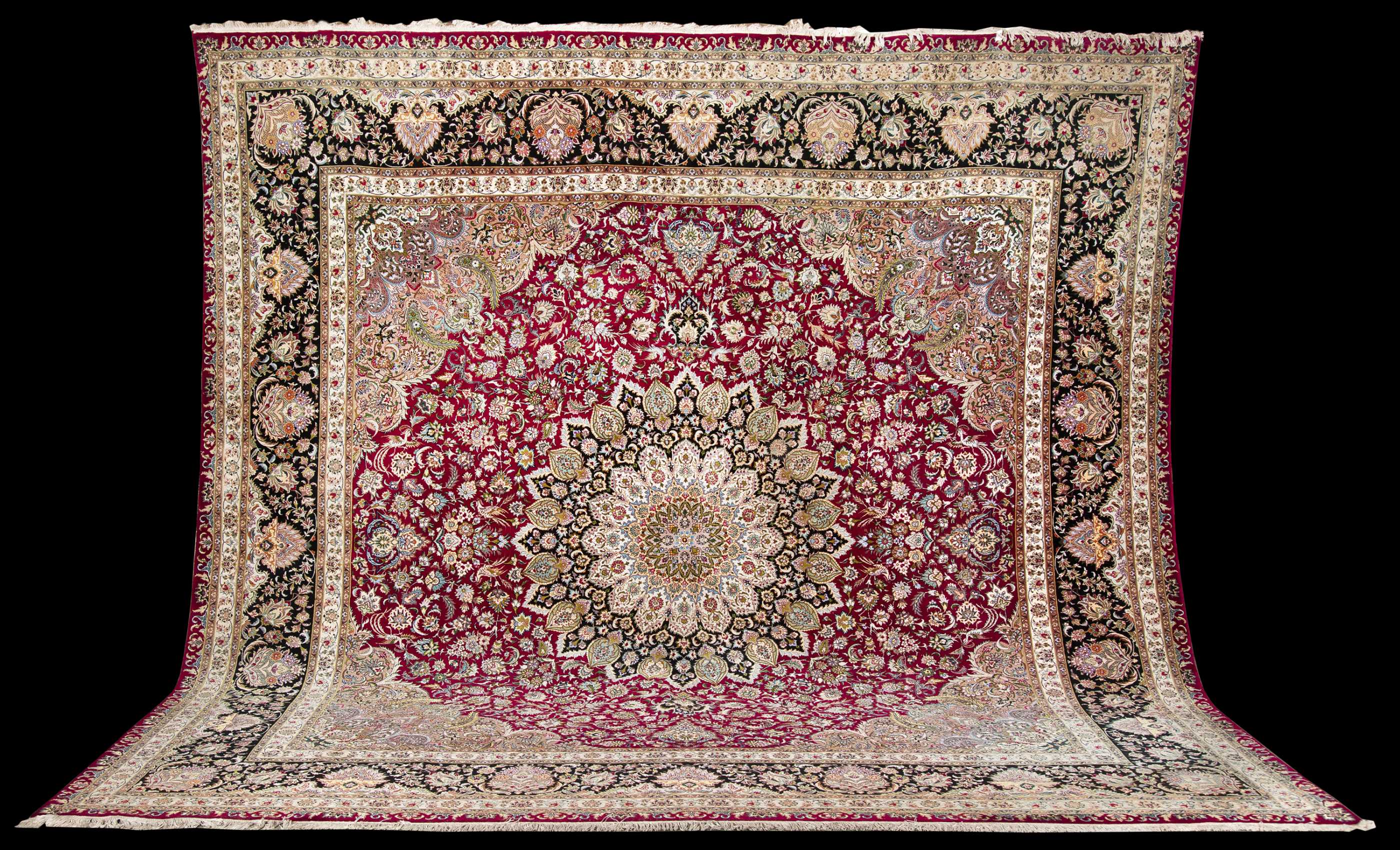 extremely fine weave having a center medallion on a dark red ground with cut corners, a modern Persian rug in excellent condition