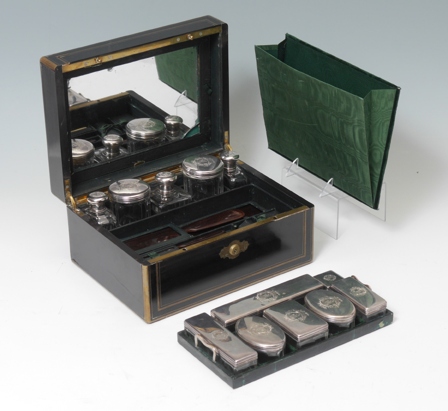 Ebonized wood box with brass inlaid medallion on hinged lid and brass trim inlay, marked Tahan A Paris. Fitted compartments with French Minerva silver marked lids to glass boxes and bottles. Lift out tray reveals brushes, combs, accoutrement, and mor